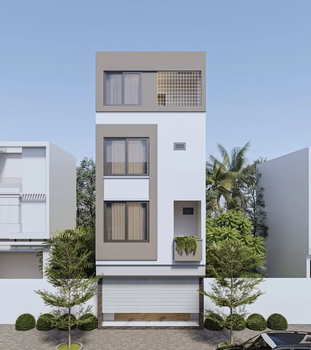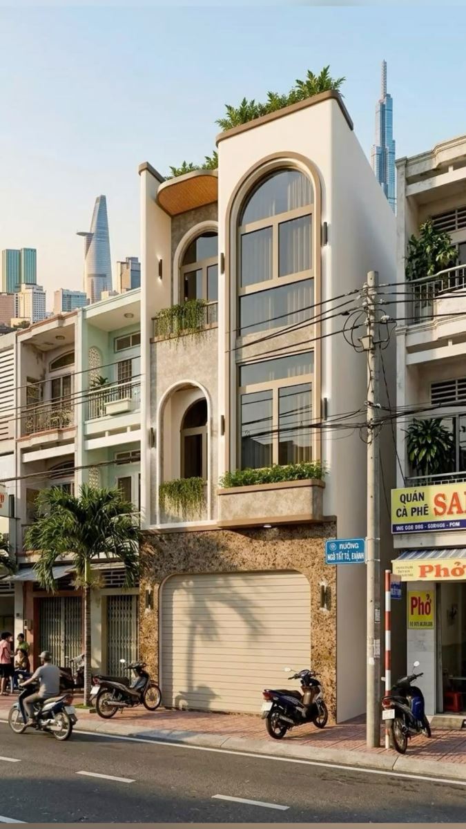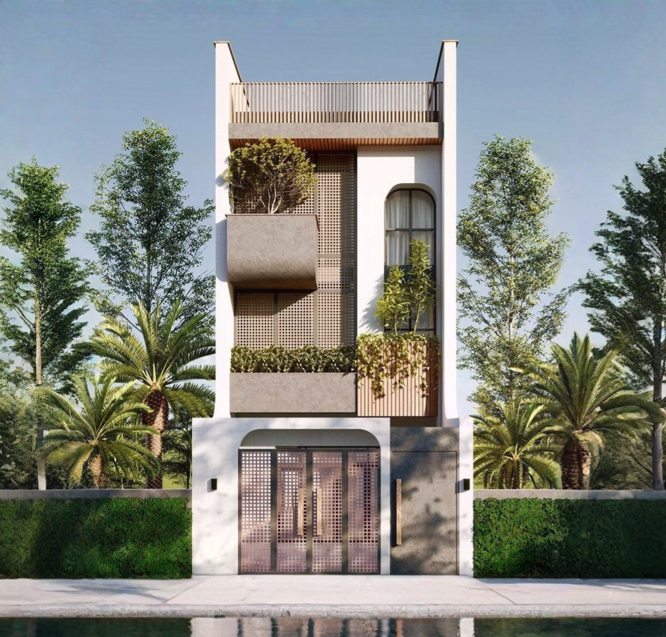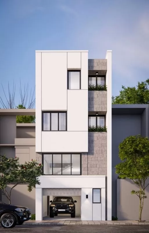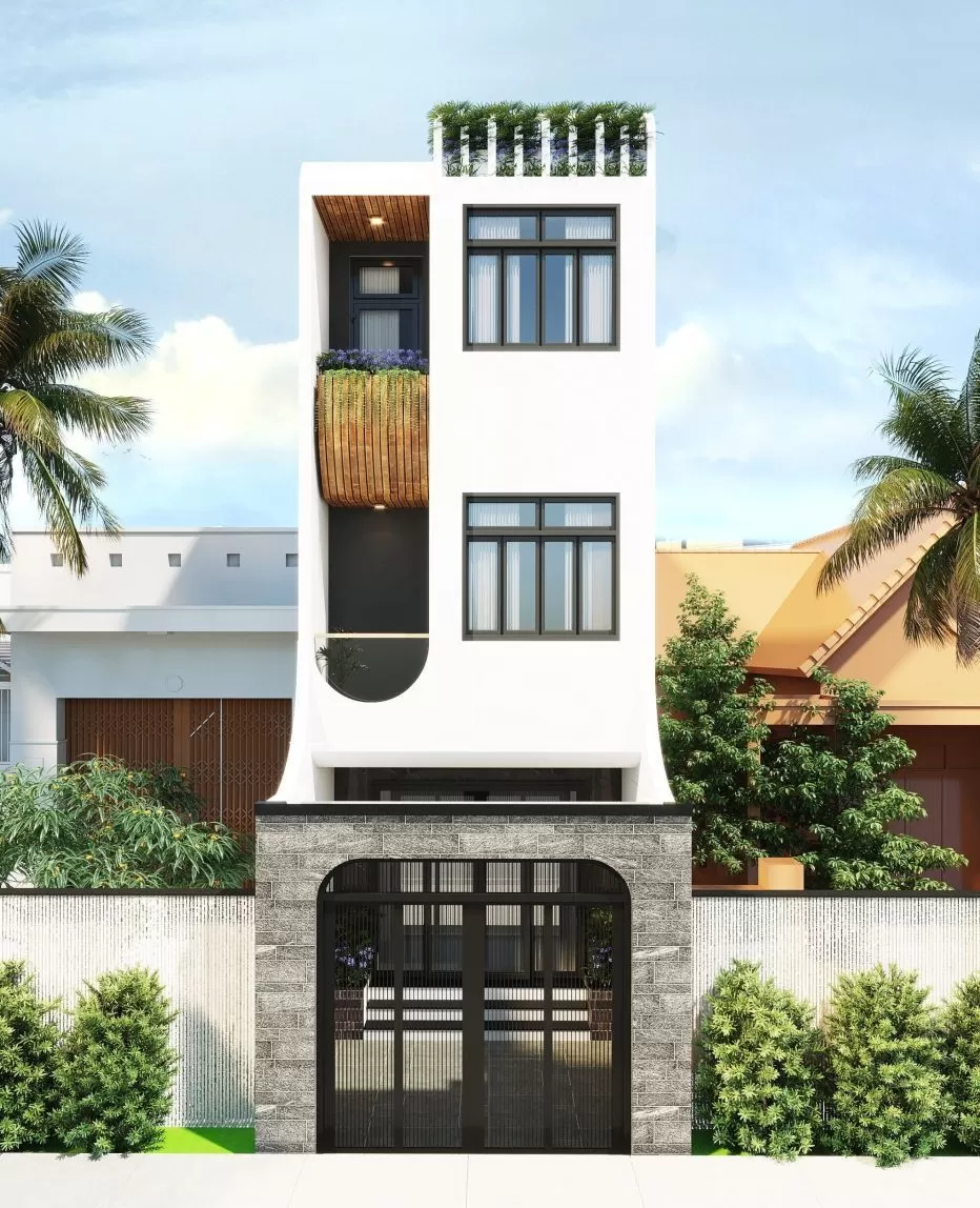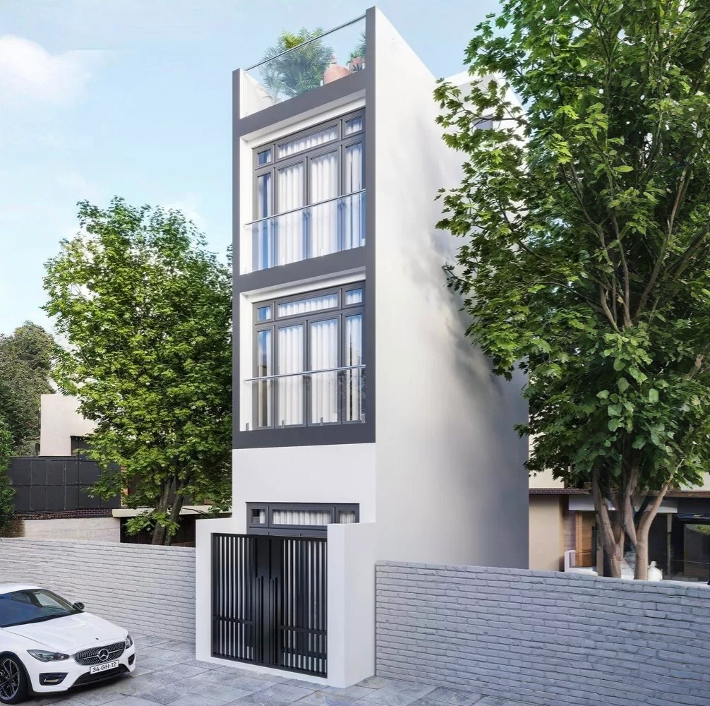 Vật liệu sử dụng thường là kính cường lực, thép sơn tĩnh điện, gỗ công nghiệp hoặc đá ốp mặt tiền, giúp tăng tính thẩm mỹ và độ bền cho công trình. Ngoài ra, việc kết hợp màu sắc trung tính như trắng, xám, be… giúp ngôi nhà trở nên thanh lịch, phù hợp với nhiều khu vực đô thị.