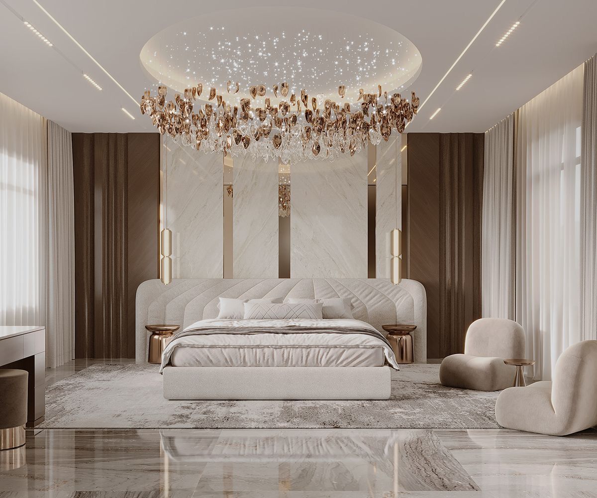 Thông thường, giường ngủ được chọn làm trung tâm bố cục. Hệ tủ, bàn trang điểm, tab đầu giường hoặc ghế thư giãn sẽ được sắp xếp xoay quanh theo nguyên tắc đối xứng hoặc bất đối xứng có kiểm soát.