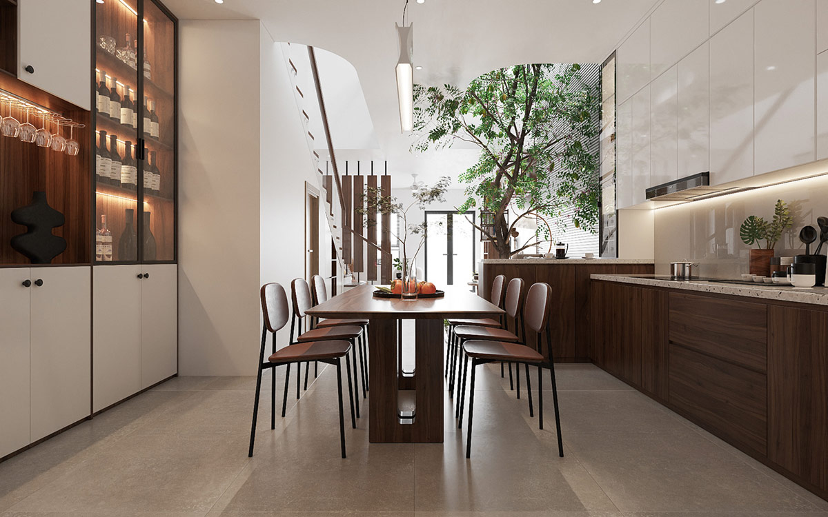 Thiết kế không gian thông thoáng: Bố trí giếng trời, cây xanh hoặc sân trong giúp nhà sáng sủa, rộng rãi và gần gũi thiên nhiên.