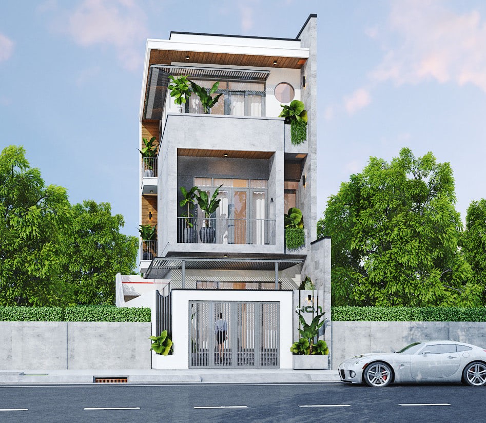 Ngôi nhà gây ấn tượng với phong cách kiến trúc hiện đại, thể hiện qua các chi tiết như sơn ngoại thất, gỗ nhựa và gạch ốp trang trí. Sự kết hợp giữa màu sắc trang nhã và bố cục kiến trúc độc đáo giúp công trình trở nên nổi bật, mang lại vẻ đẹp hiện đại và ấn tượng cho tổng thể không gian.
