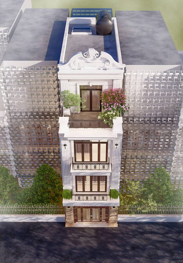 Biệt thự cổ điển nổi bật với hệ hình khối bề thế cùng các chi tiết phào chỉ cầu kỳ và hệ cột trang trí đặc trưng. Trong thiết kế, các cột vuông thường được sử dụng ở những vị trí chính để làm trụ đỡ cho công trình, trong khi hệ cột tròn được bố trí xen kẽ nhằm tạo điểm nhấn thẩm mỹ và hỗ trợ kết cấu.