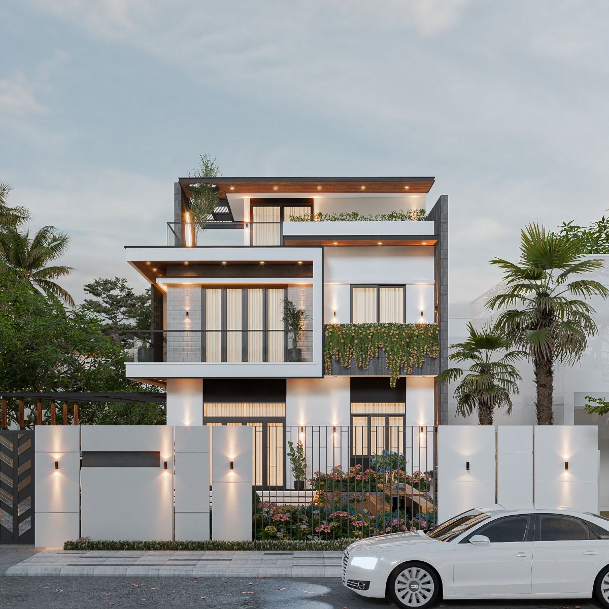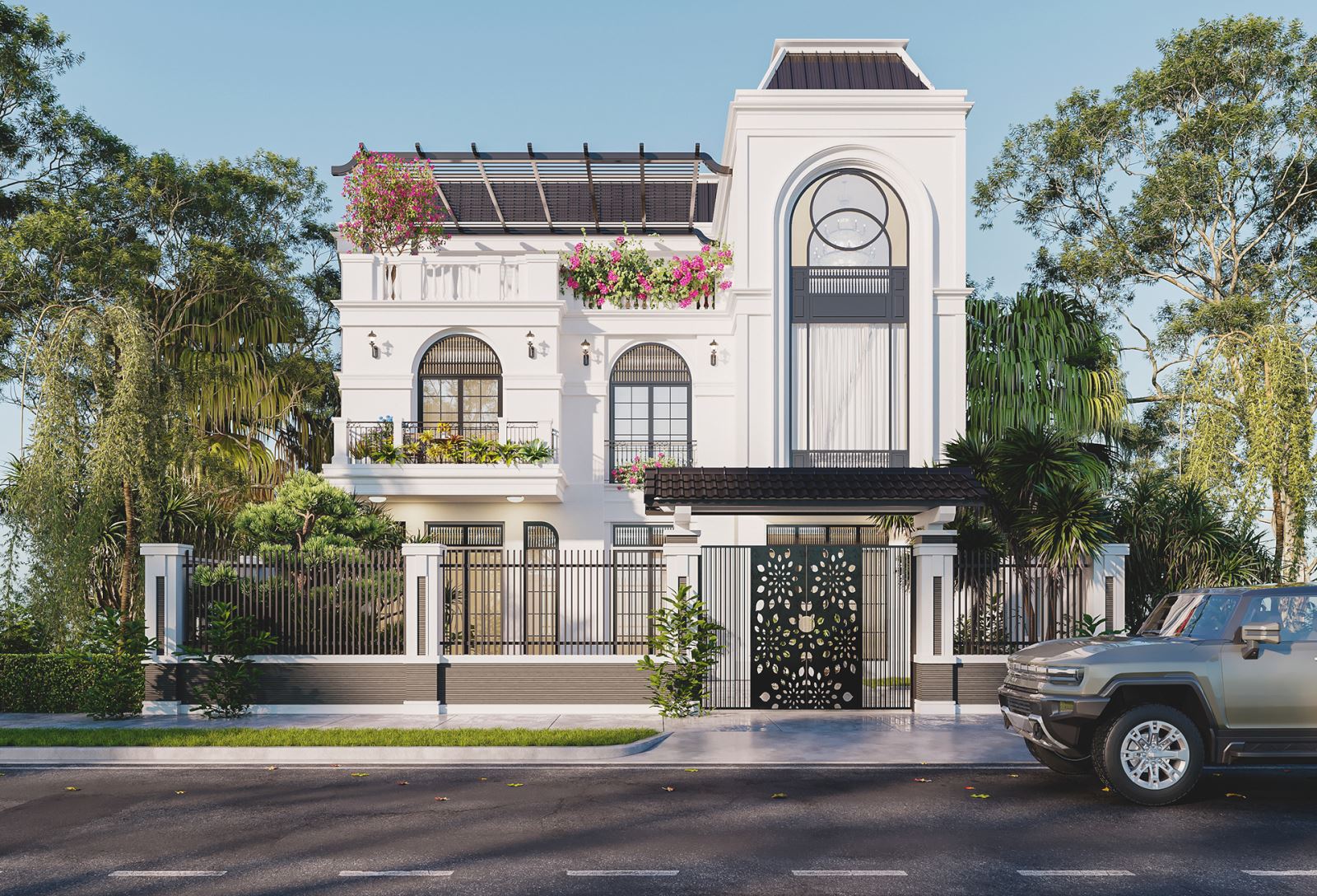 Ngoại thất sử dụng các gam màu trung tính như trắng sứ, kem và ghi xám, tạo nên vẻ đẹp thanh lịch, sang trọng tương tự các biệt thự châu Âu. Những tông màu này đồng thời làm nổi bật các vật liệu cao cấp như đá granite hay các chi tiết trang trí kim loại, góp phần tăng giá trị thẩm mỹ cho toàn bộ công trình.