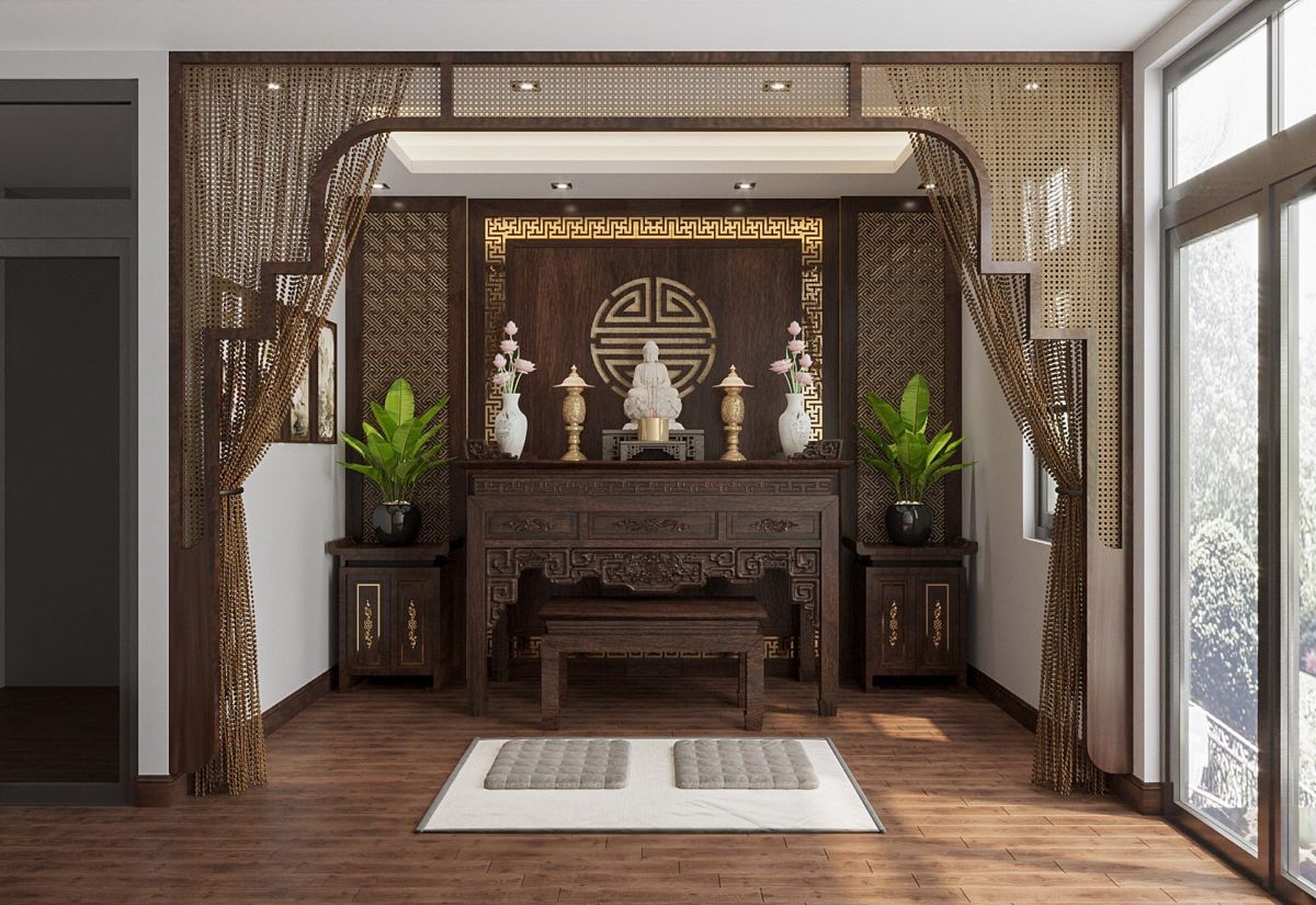 Nếu không gian hạn chế, gia chủ có thể dùng vách ngăn, tủ thờ hoặc rèm che để tạo sự riêng tư, vừa đảm bảo tính thẩm mỹ vừa giữ được năng lượng phong thủy ổn định.