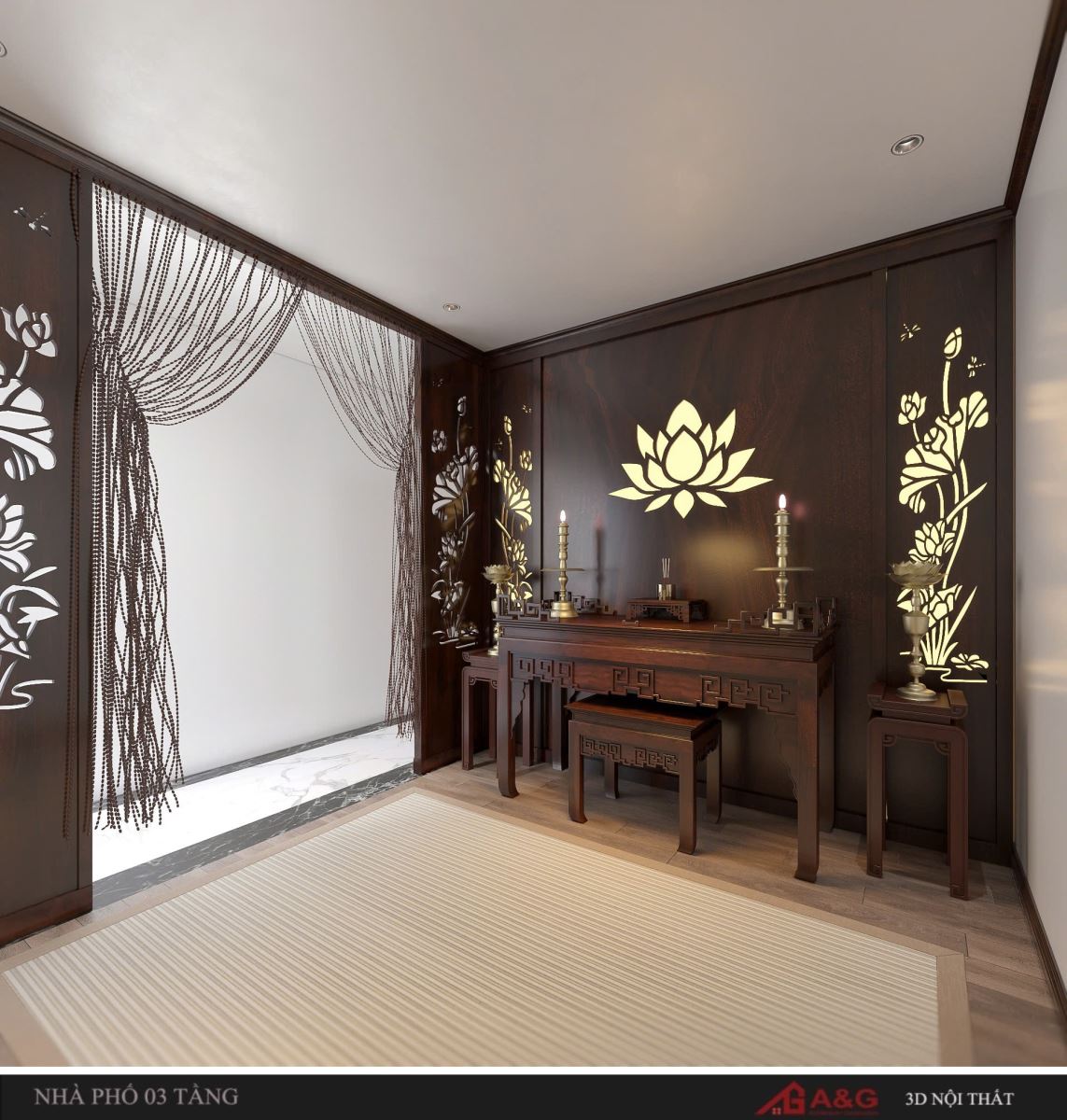 Nhà chung cư: Thường có diện tích hạn chế, bàn thờ thường đặt trong phòng khách. Các kiến trúc sư của A&G Việt Nam sẽ tư vấn hướng tốt nhất trong phạm vi có thể, vừa đảm bảo thẩm mỹ vừa hợp phong thủy.