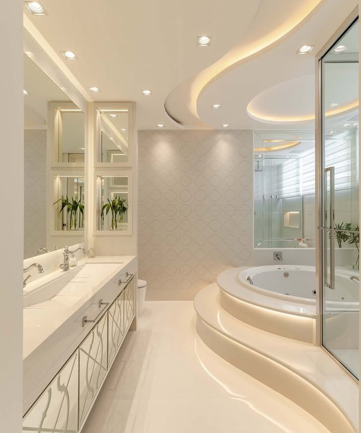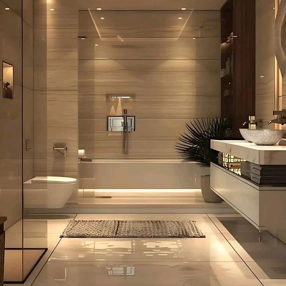 Kết hợp hệ thống chiếu sáng đa lớp gồm đèn trần, đèn gương và đèn hắt để ánh sáng phân bổ đều, linh hoạt theo nhu cầu sử dụng.