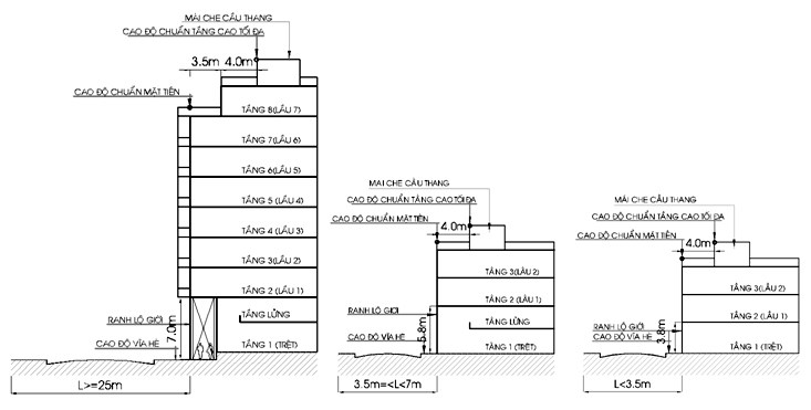 Lô đất từ 40m² đến 50m²: Mặt tiền trên 3m và dưới 8m, chiều sâu trên 5m, được phép xây không quá 5 tầng + 1 tum hoặc có mái chống nóng, tổng chiều cao dưới 20m.