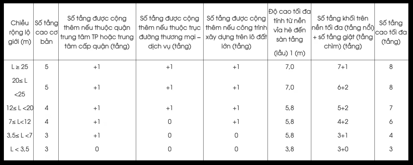 Độ cao tầng tối đa 7m: Áp dụng cho nhà ở có đường lộ giới từ 20m trở lên. Trường hợp này được phép bố trí tầng lửng, với tổng chiều cao tối đa từ mặt sàn tầng trệt đến mặt sàn lầu 1 không vượt quá 7m.