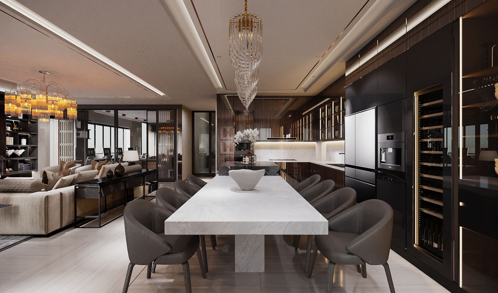 Trong biệt thự liền kề, khu vực bếp và phòng ăn thường được thiết kế liền mạch hoặc bố trí tách biệt linh hoạt. Đây là không gian sinh hoạt quan trọng, gắn kết các thành viên thông qua những bữa ăn gia đình.