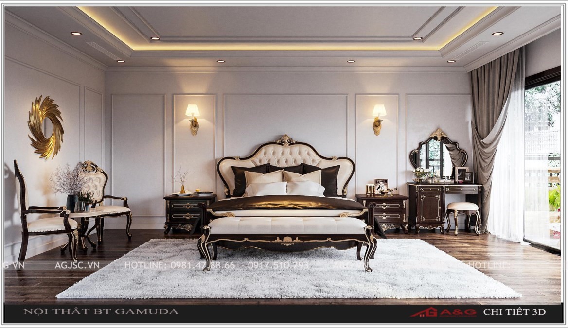 Phòng ngủ là không gian riêng tư dành cho nghỉ ngơi và thư giãn, vì vậy thiết kế nội thất cần đảm bảo sự thoải mái đồng thời vẫn thể hiện được nét sang trọng đặc trưng của phong cách tân cổ điển.