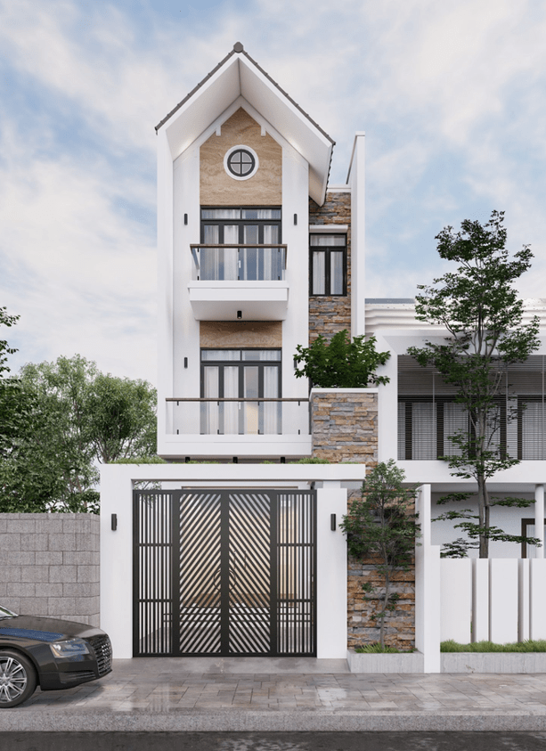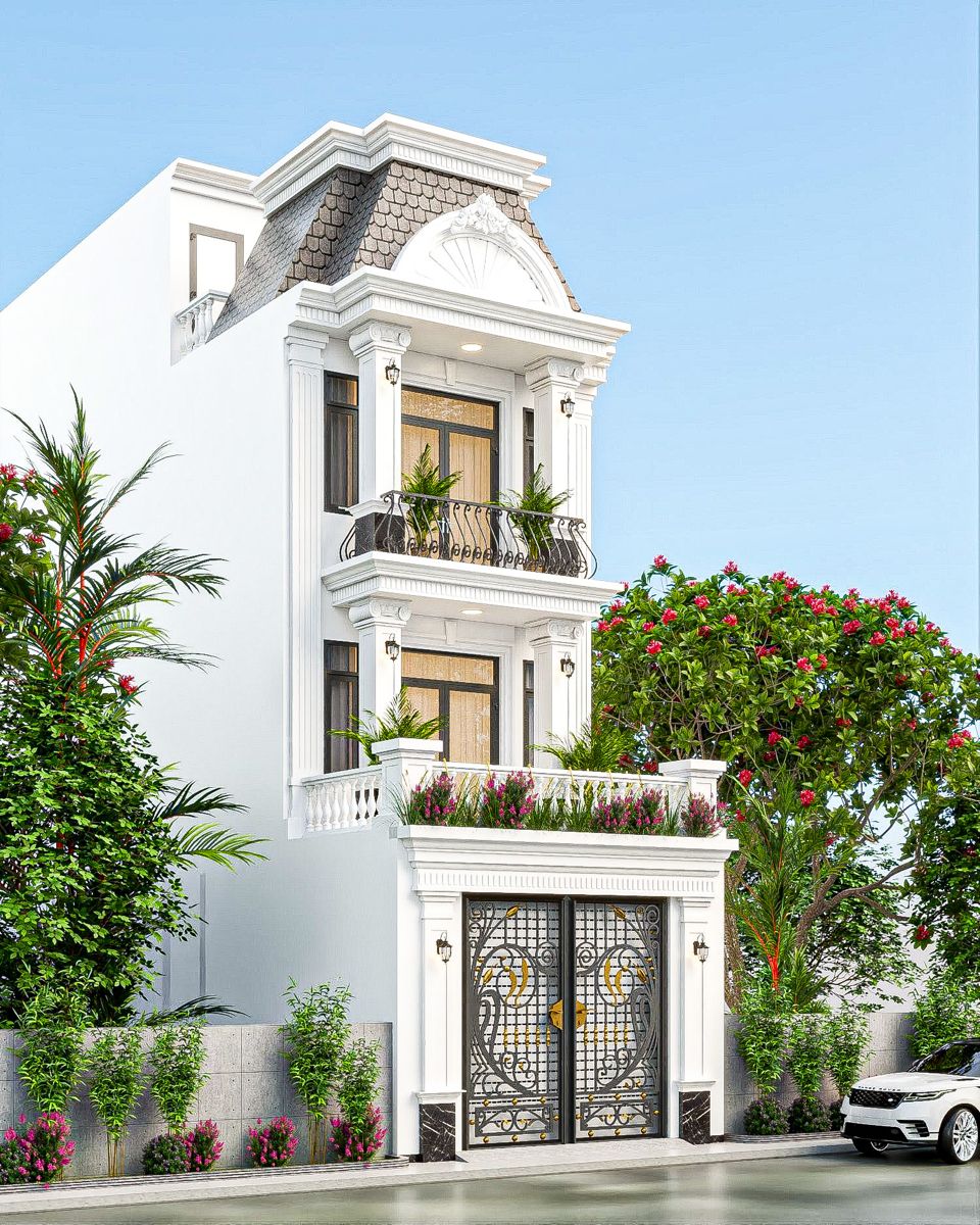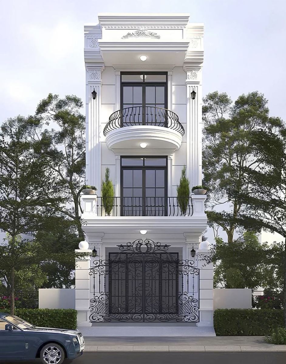 Phong cách tân cổ điển chú trọng sự kết hợp giữa kiến trúc cổ điển và các tiện nghi hiện đại, mang đến sự tinh tế và sang trọng cho không gian sống. Sân trước của nhà ống 3 tầng tân cổ điển thường được bố trí bồn hoa, tiểu cảnh hoặc các chi tiết trang trí nhẹ nhàng, giúp công trình vừa thể hiện sự đẳng cấp, vừa gần gũi, ấm cúng. Kiểu nhà này phù hợp với những gia chủ yêu thích nét sang trọng nhưng vẫn muốn giữ cảm giác hiện đại, tiện nghi trong sinh hoạt hàng ngày.
