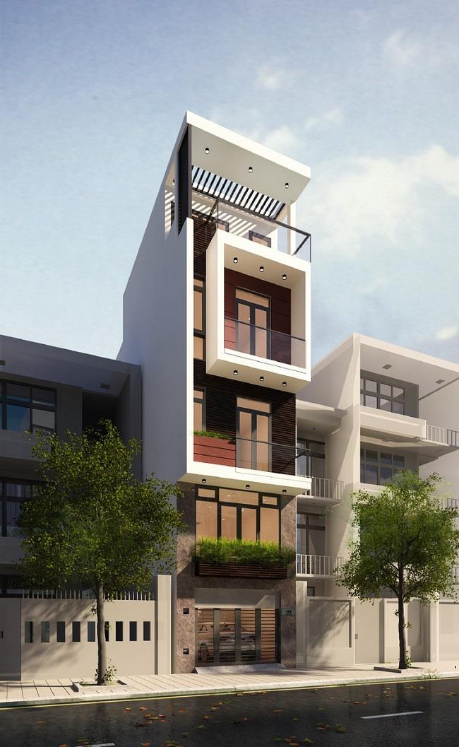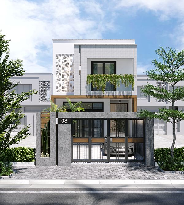 Thông thường, thiết kế sẽ tận dụng hệ cửa kính lớn, ban công nhỏ hoặc lam trang trí nhằm tăng khả năng đón ánh sáng và giúp mặt tiền trở nên thông thoáng hơn. Cách xử lý này cũng giúp ngôi nhà có cảm giác rộng rãi hơn so với kích thước thực tế.