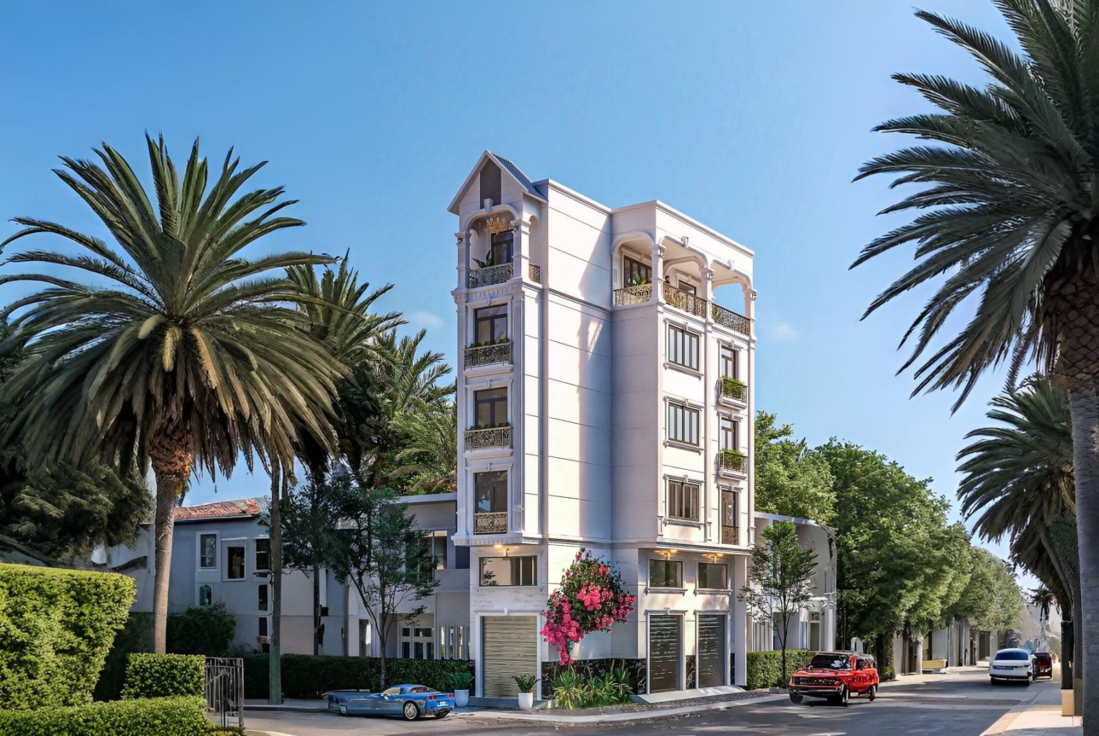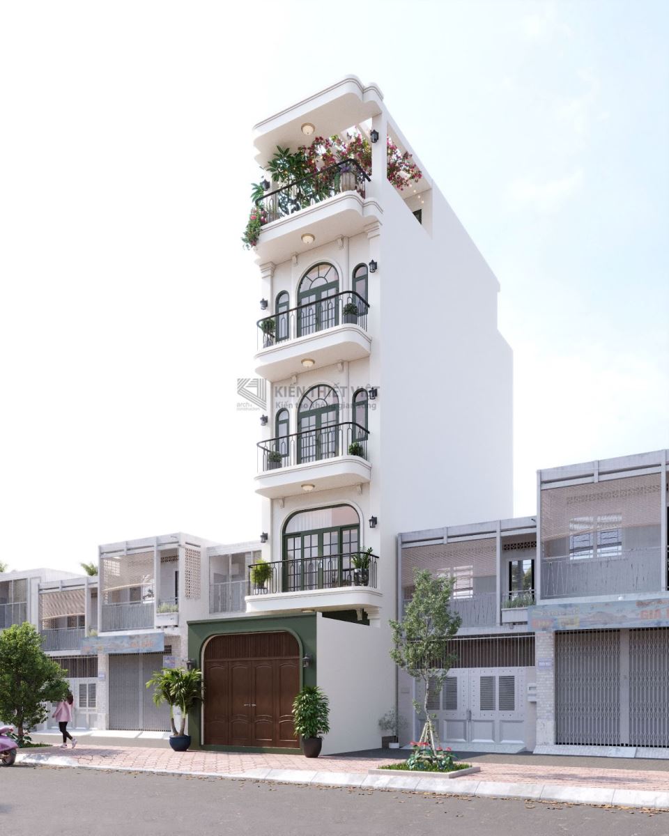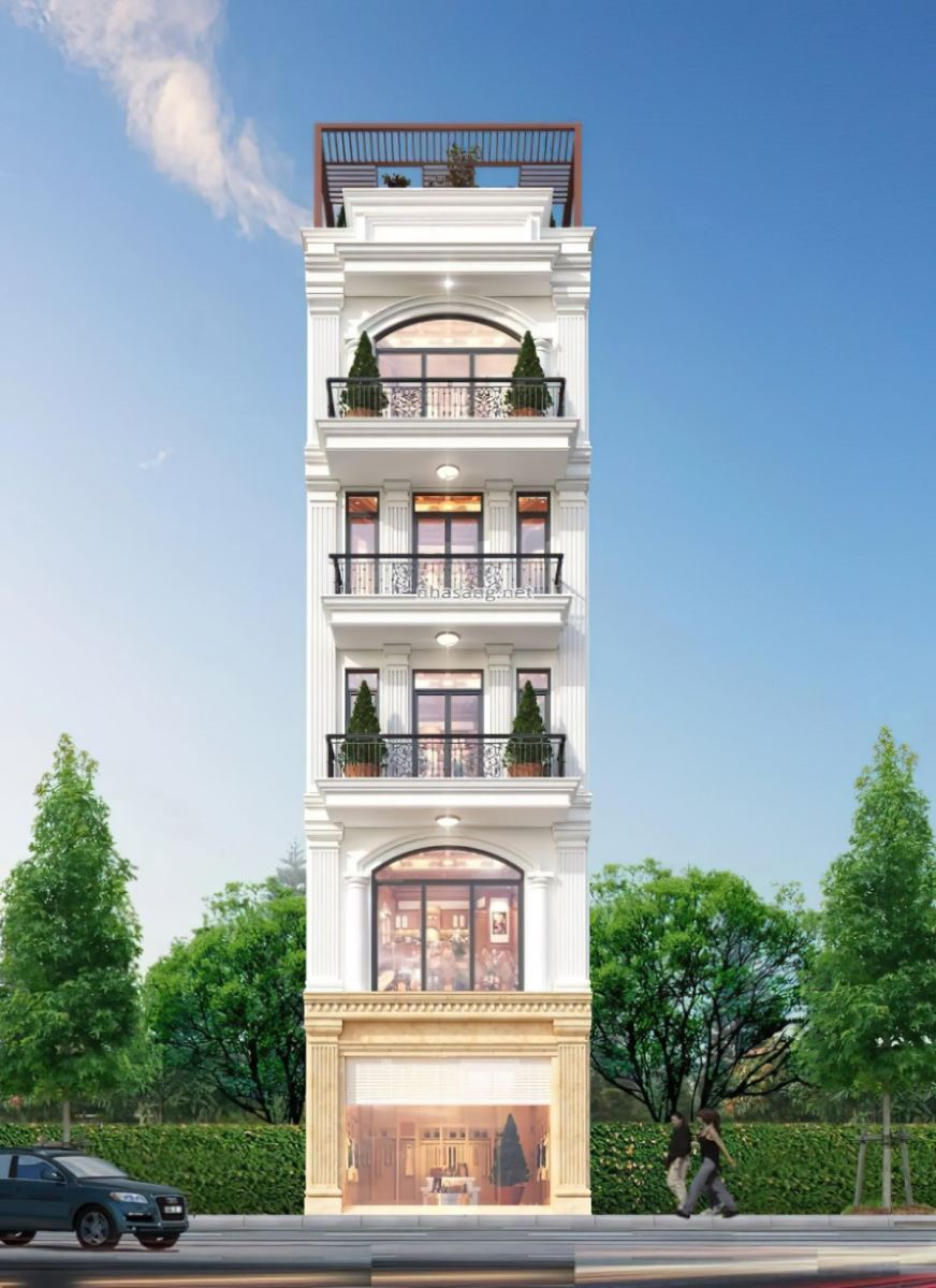 Mẫu nhà 5 tầng tân cổ điển là sự giao thoa hoàn hảo giữa vẻ đẹp cổ điển sang trọng và tiện ích hiện đại. Kiến trúc nổi bật với phào chỉ tinh tế, cột trụ tráng lệ, ban công uốn cong mềm mại, kết hợp với tông màu trắng – kem chủ đạo cùng đá ốp cao cấp, tạo nên hình ảnh quyền quý và đẳng cấp.