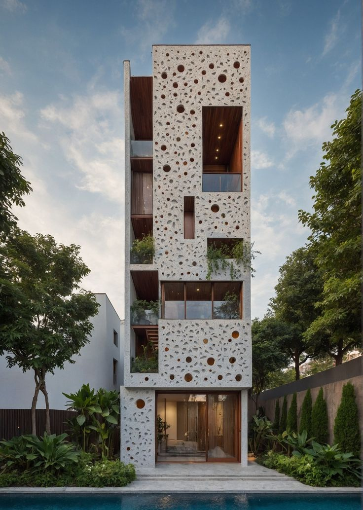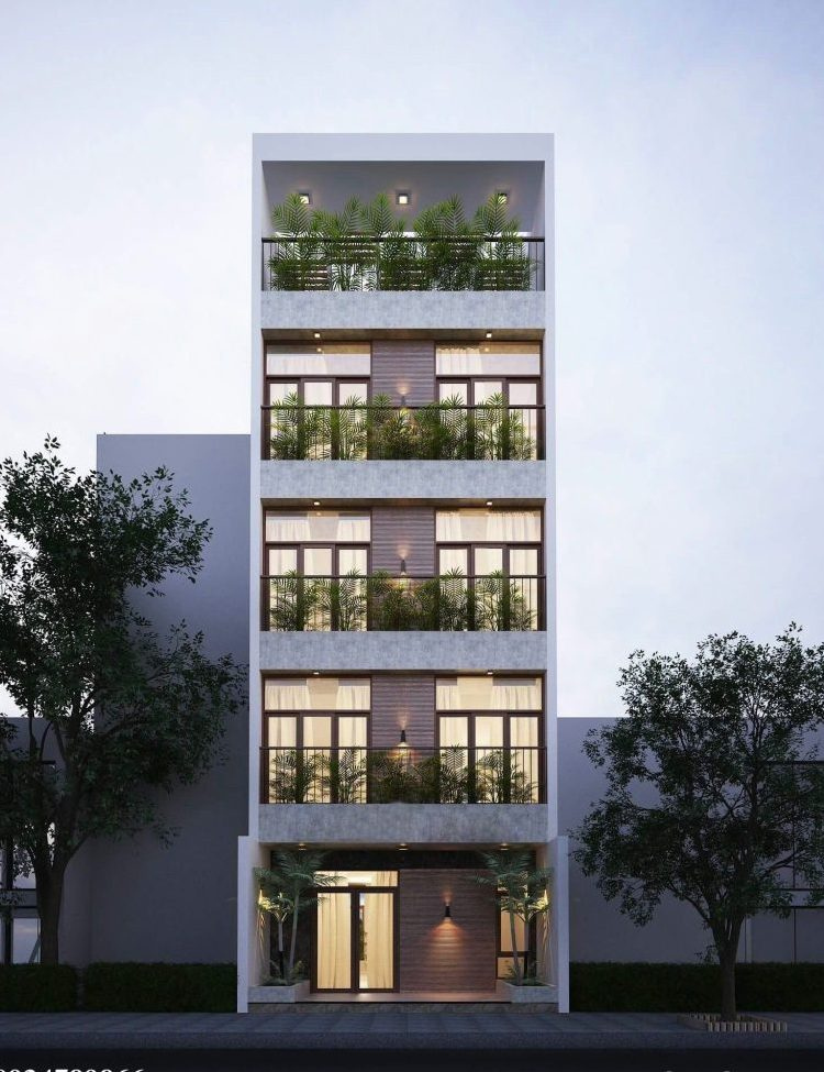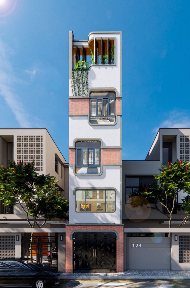 Nhà 5 tầng hiện đại gây ấn tượng với phong cách trẻ trung, năng động, sử dụng các đường nét vuông vức, mảng khối đơn giản nhưng tinh tế. Mặt tiền thường kết hợp kính cường lực, lam chắn nắng hoặc vật liệu hiện đại, giúp ánh sáng tự nhiên tràn ngập mọi không gian, tạo cảm giác rộng rãi và thoáng đãng.