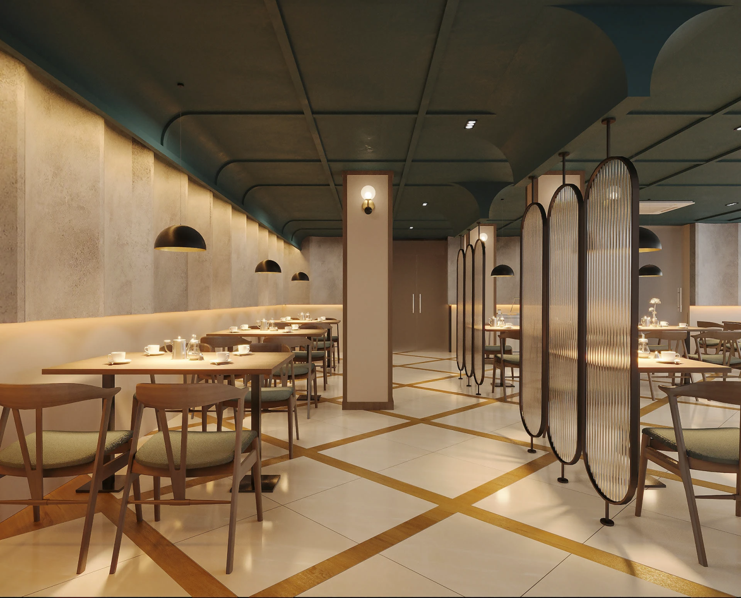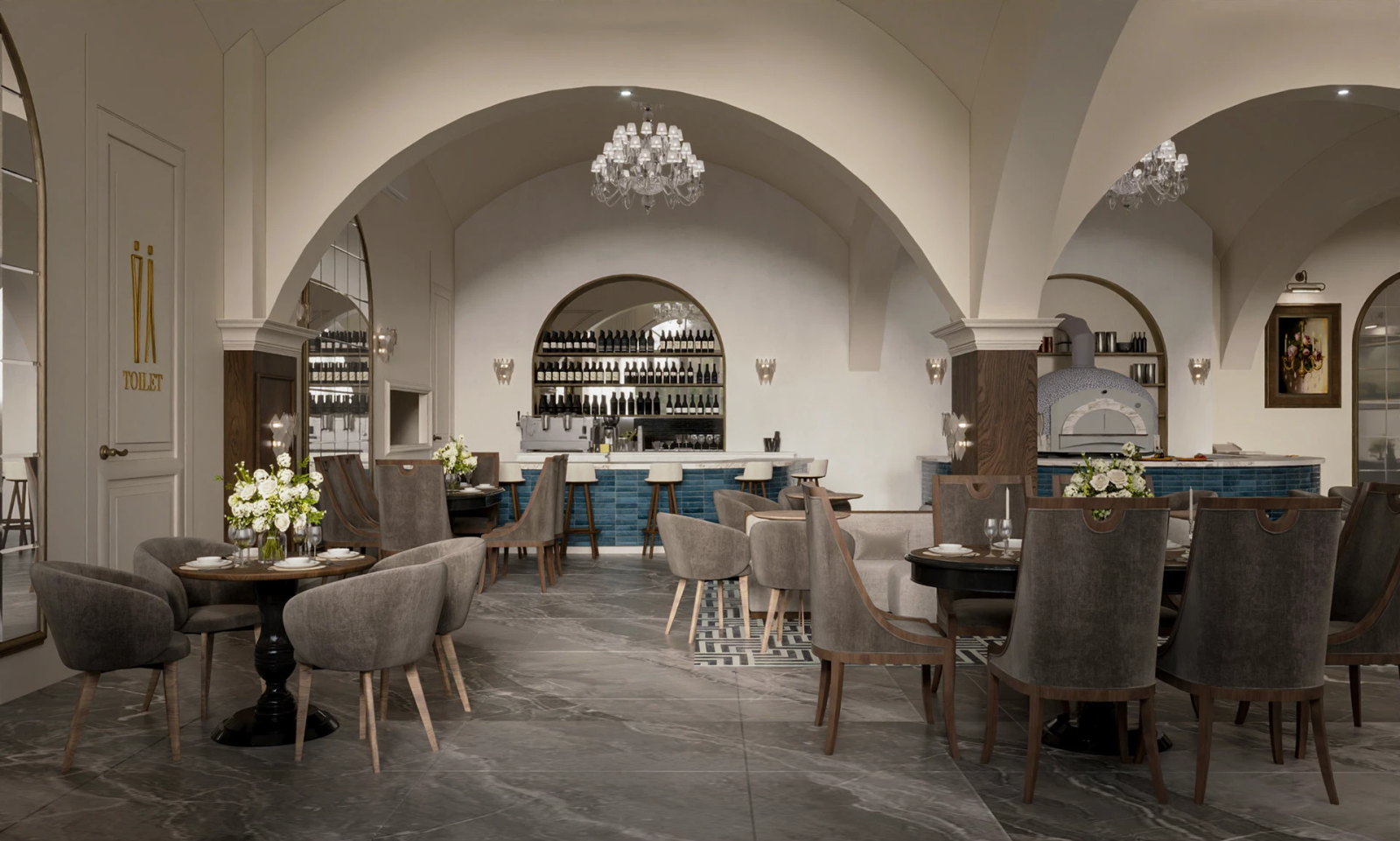 Nhà hàng theo phong cách này phù hợp với những không gian sang trọng, tiệc cưới hoặc ẩm thực Âu, mang lại trải nghiệm quyền quý, tinh tế, đồng thời thể hiện sự đẳng cấp và gu thẩm mỹ tinh vi của chủ đầu tư.